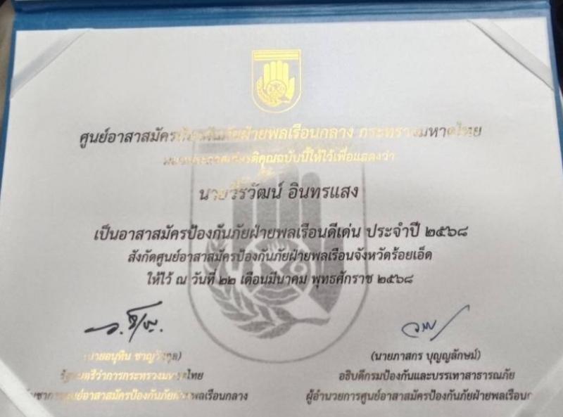 นายทินกร พุทธลา นายกองค์การบริหารส่วนตำบลศรีโคตร ได้มอบหมายให้ นายศรัณยู ขวาป้องใต้ รองนายก อบต.ศรีโคตร พร้อมด้วยนายอรรคเดช เจริญธนิตกุล นักป้องกันและบรรเทาสาธารณภัย นายเอนก เขื่อนเพชร ผู้ช่วยเจ้าพนักงานป้องกันและบรรเทาสาธารณภัย เข้าร่วมงานการรับใบประกาศเกียรติคุณและเข็มเชิดชูเกียรติ นายวีรวัฒน์ อินทรแสง อปพร.สังกัดองค์การบริหารส่วนตำบลศรีโคตร ได้รับการคัดเลือกเป็น อปพร. ดีเด่น ประจำปี ๒๕๖๘ ระดับประเทศ โดยมี นายชัชวาลย์ เบญจสิริวงศ์ ผู้ว่าราชการจังหวัดร้อยเอ็ด เป็นประธานในพิธี ณ งานป้องกันและบรรเทาสาธารณภัย เทศบาลเมืองร้อยเอ็ด ตำบลในเมือง อำเภอเมืองร้อยเอ็ด
