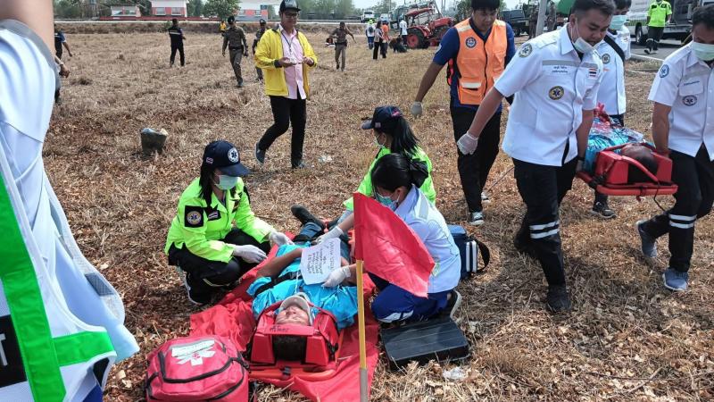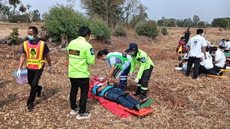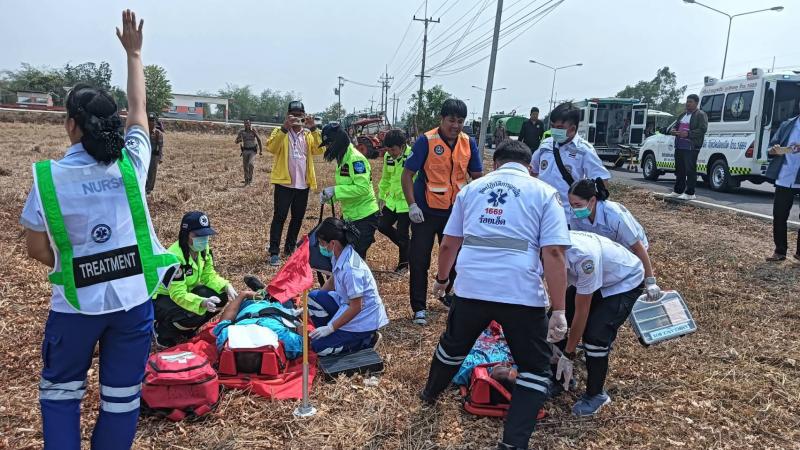 ซักซ้อมแผนอุบัติเหตุหมู่ ณ สถานที่ ถนนจตุพรพักตรพิมาน-ร้อยเอ็ด หน้าโรงสีข้าวสนธยา เพื่อทบทวนความรู้ เตรียมความพร้อมรับมืออุบัติเหตุในช่วงเทศกาลสงกรานต์