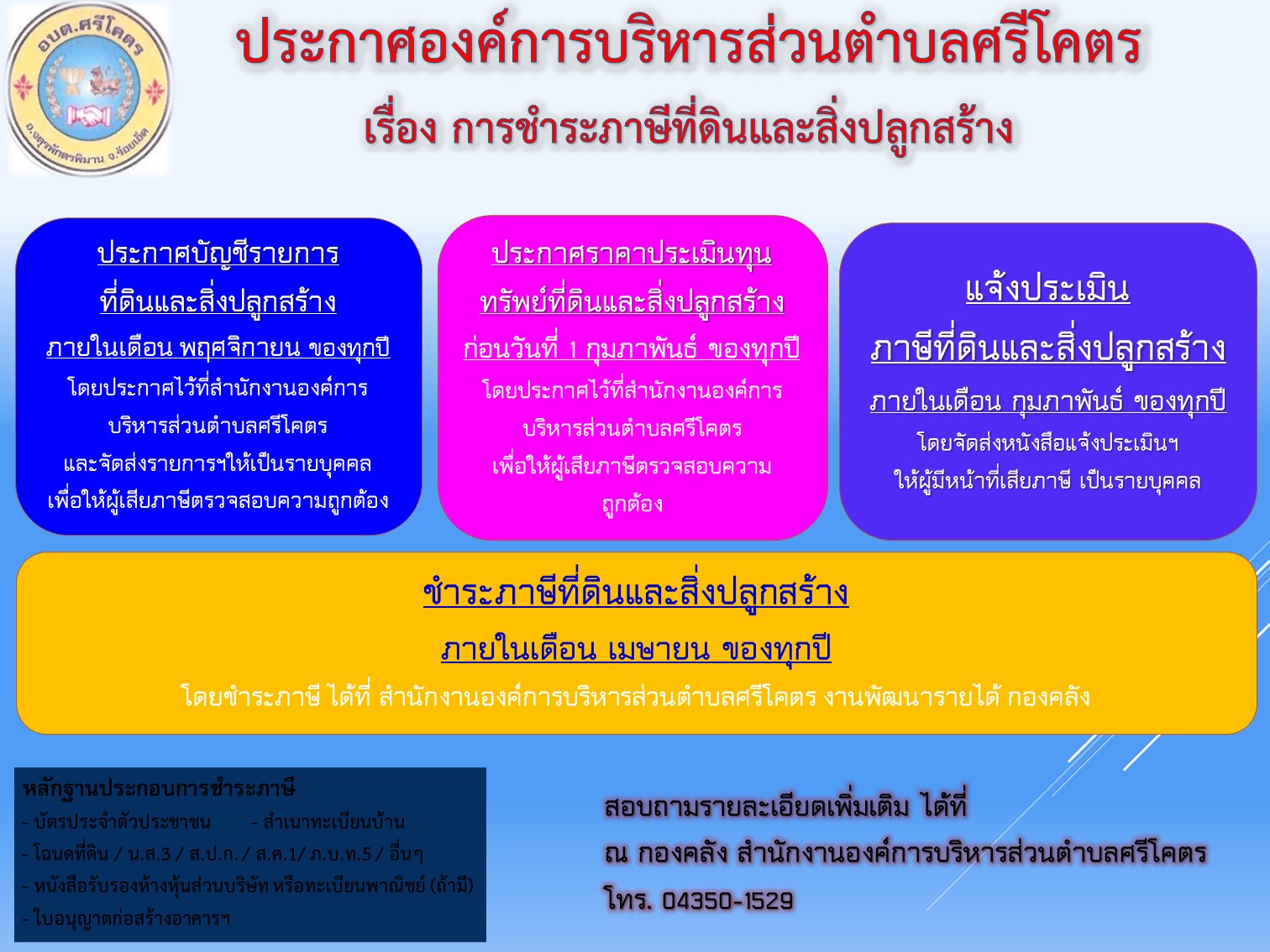 ชื่อเรื่อง : ประกาศองค์การบริหารส่วนตำบลศรีโคตร เรื่อง การชำะภาษีที่ดินและสิ่งปลูกสร้าง