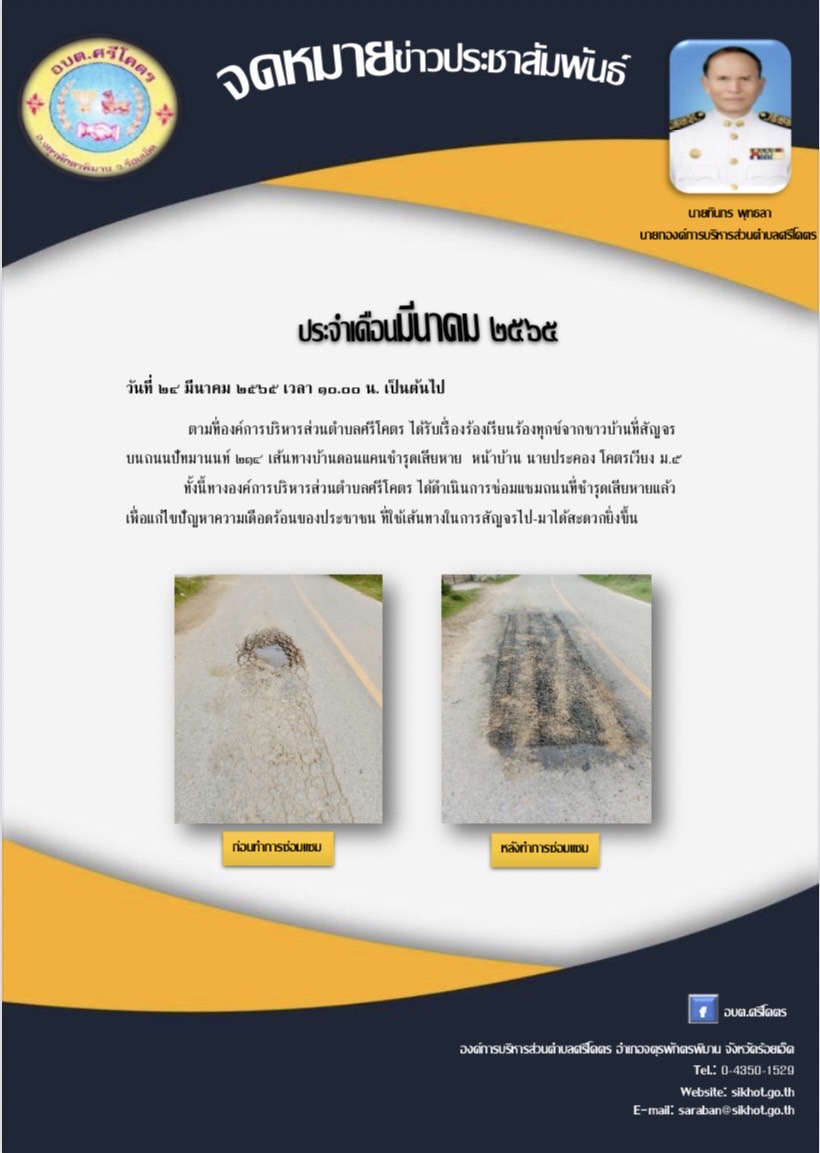 วันที่ 24 มีนาคม 2565 องค์การบริหารส่วนตำบลศรีโคตร ได้ดำเนินการซ่อมแซมถนนที่ชำรุดเสียหายแล้วเพื่อแก้ไขปัญหาความเดือดร้อนของประชาชน ที่ใช้เส้นทางในการสัญจรไป-มาได้สะดวกขึ้น