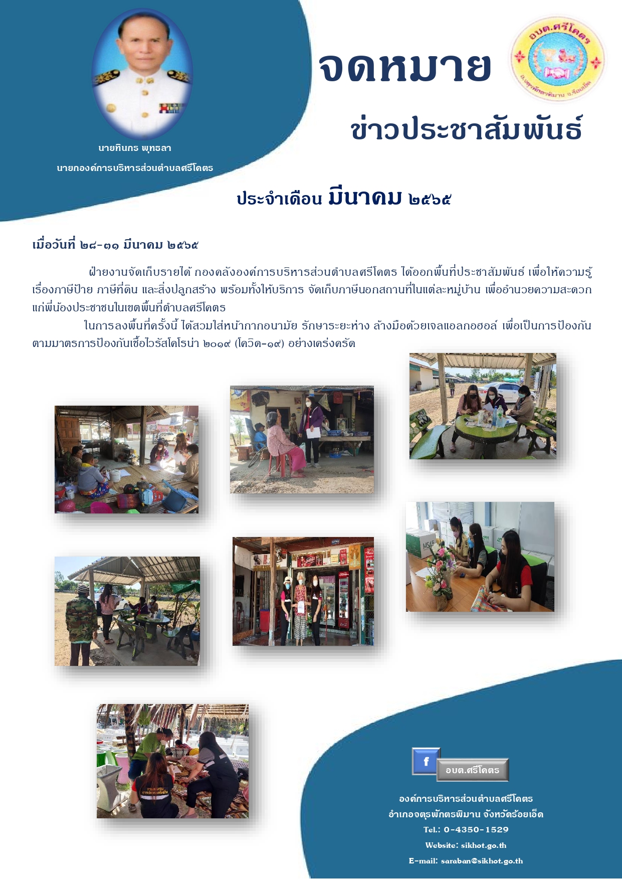 ชื่อเรื่อง : ออกพื้นที่ประชาสัมพันธ์ เพื่อให้ความรู้เรื่องภาษีป้าย ภาษีที่ดิน และสิ่งปลูกสร้าง พร้อมทั้งให้บริการ จัดเก็บภาษีนอกสถานที่ในแต่ละหมู่บ้าน เพื่ออำนวยความสะดวก แก่พี่น้องประชาชนในเขตพื้นที่ตำบลศรีโคตร