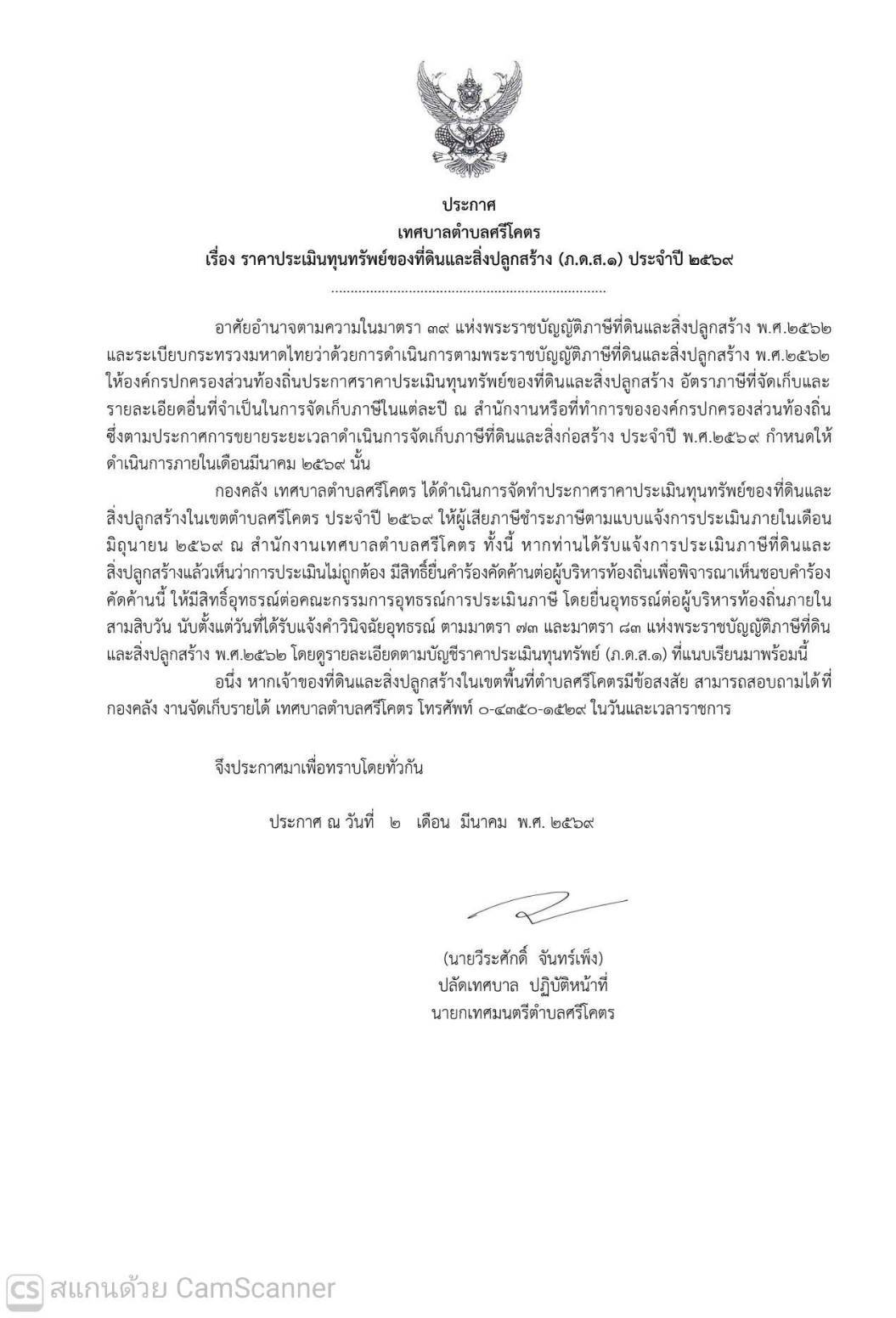 ประกาศเทศบาลตำบลศรีโคตร เรื่อง ราคาประเมินทุนทรัพย์ของที่ดินและสิ่งปลูกสร้าง (ภ.ด.ส.1) ประจำปี 2569